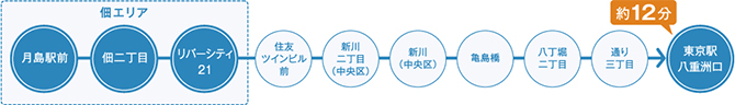 多忙な日々を送る佃ビジネスパーソンにとってアクセスのステキと言えば東京駅ダイレクトアクセスを実現する都営バス【東16】系統だ。たとえば「月島駅前」「佃二丁目」「リバーシティ21」バス停を利用すれば、東京駅八重洲口まで約12分。朝の時間を有意義に使うことができるし、雨の日の通勤もラクラク。また、荷物が多い地方への出張での新幹線利用もラクラク。通勤時間帯には1時間に11本が運行されており、待ち時間ストレスがない點も魅力となっている。