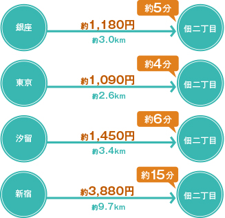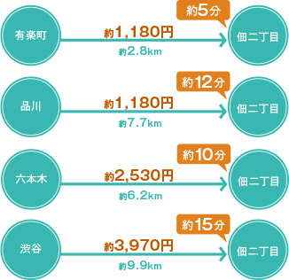 公私に忙しい日々を送る佃ビジネスパーソン。繁忙期の対応や、クライアントや異業種ビジネスパーソンとの交流などで、時にはタクシーでの深夜帰宅なんてことも。そんな佃ビジネスパーソンにとって、タクシーの利用しやすさもステキのひとつかもしれない。下の表を見ていただきたい。東京駅や銀座からだとおよそ約5分で佃に辿り著いてしまう。汐留や六本木だって約10分圏。もちろん近いから利用料金をしっかり抑えられることも魅力となっている。