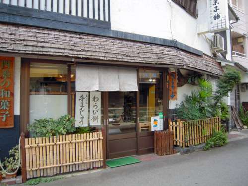 道後溫泉にほど近い民家の建ち並ぶ路地の一角に、まるでひっそりと隠れるように看板を掲げている西岡菓子舗(分譲地から約86km)。