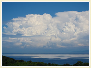 海のブルーと白い雲の寫る水面が美しく、空の分量を多くとった構図も雄大さを出しています。