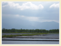 - 水をたたえた田んぼに、田植えを終えたばかりの稲が美しい直線を描いています。