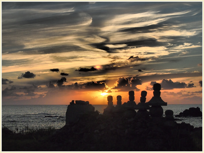 特に雲の模様が神秘的で、供養塔がまるで生き物のように夕陽に向かって歩いているような錯覚を覚える素晴らしい作品です。
