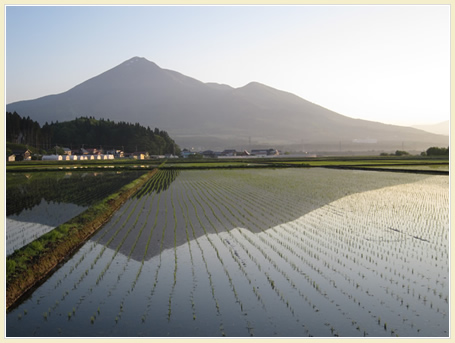 水田に映った磐梯山と集落、朝日を受けたビニールハウスなどがおりなす風景に心を奪われた。
