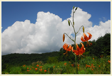 沢山の中から一本のオニユリを選び、山と雲を背景にし、やや右に配して撮ったことでバランスが整いました。