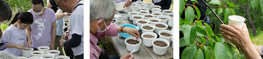 公益財団法人 吉野山保勝會と協働で吉野山に桜育成園を設置。古來から吉野で受け継がれてきたシロヤマザクラを、山中の母種から得られる種を使い育成しています。1年のサイクルを通じて、一つひとつの作業が桜の育成にむすびついていることを學び、元気に育つように、1本1本丁寧に育てています。