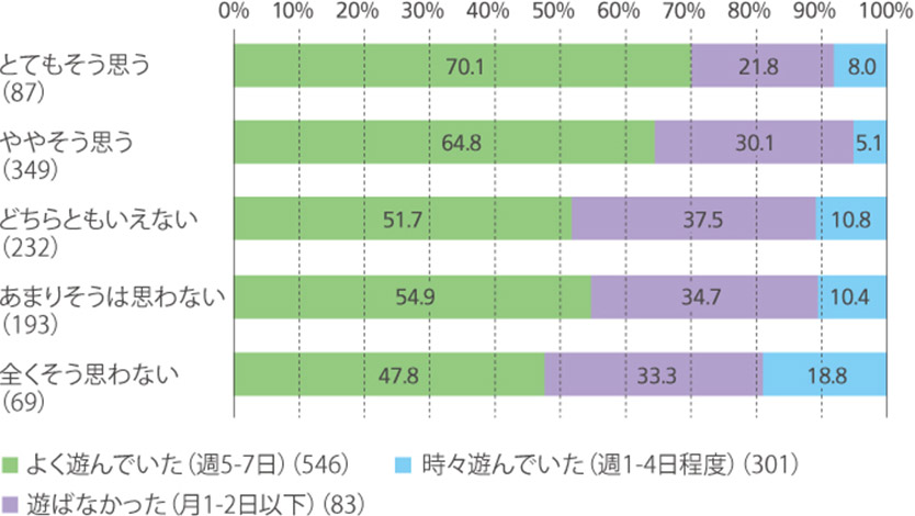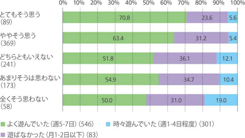 これを表すおもしろい調(diào)査結(jié)果があります。民間企業(yè)に勤める全國の若手社會人930人を?qū)澫螭藢g施した調(diào)査(※1)では、子ども時代によく遊んだ人ほど自分のことを肯定的に評価し、前向きな考え方を持つことが分かっています。あそびの経験が社會人になってからも影響するとは驚きです。