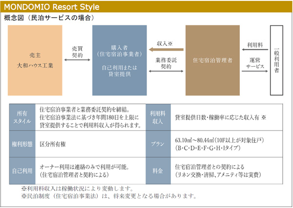 1.マンション所有の新しいかたち「モンドミオ リゾートスタイル」 「モンドミオ沖縄リゾート ライカムヒルズ」は、県外からの購(gòu)入者が多いリゾートエリアの分譲マンションという特色を最大限活かすため、オーナー様の利用スタイルに合わせてマンションを資産として活用できるサポートプラン「モンドミオ リゾートスタイル」を提案します。 「モンドミオ リゾートスタイル」は、オーナー様が住居として利用していない期間、民泊サービスとして活用できるよう、住宅宿泊管理者の紹介を行います。オーナー様が住宅宿泊事業(yè)者となり、民泊サービスを提供することで、貸室としての提供日數(shù)?稼働率に応じて賃料収入を得ることができます。また、マンスリーレンタルとの併用も可能で、永住を目的とした自らの住居利用や、二拠點(diǎn)生活を前提としたセカンドハウス利用だけではなく、より資産性を重視した新たな所有のあり方もサポートします。