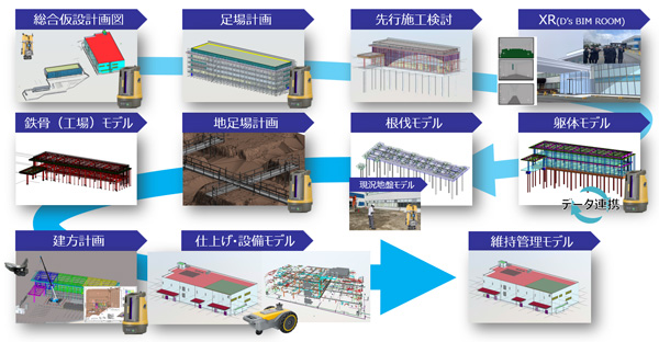 両社は、協業第一弾として、2019年12月に著工したトプコンの製造子會社である株式會社トプコンオプトネクサス(福島県田村市)の工場の建設工事では、敷地測量や基礎工事などの各工程において、BIMを用い、トプコンのデジタル測量機器やICT自動化施工技術を導入。その結果、現場作業の省力化、生産性が大幅に向上し、BIMと建設工事現場の連攜に向けた実踐的な取り組みの有効性が実証されました。 2020年11月には、デジタルコンストラクションの実現に向けて「基本合意書」を締結。その後、両社の知見を活かし、トプコンが鉄骨建方をサポートするスマートフォンアプリ『楽直(※2)を発売。大和ハウス工業では、施工現場で測量作業の省力化を実現するレイアウトナビゲーターの活用が定著するなど、現場のDX(デジタルトランスフォーメーション)化を推進することで、現在では、同社の全國の施工現場(※3)において、トプコンの機器を導入しています。 そしてこのたび竣工したトプコン山形の工場の建設工事において、両社のこれまでの取り組みをさらに進化させ、設計段階での活用にとどまっていたBIMを施工フェーズにも拡張。現場の工事擔當者からは「施工現場での計畫ミスや是正工事が少なくなった」「作業の進捗がすぐにわかるので、次の施工段取りや判斷が早くできるようになった」との聲が上がるなど、バーチャル空間と現場が連動する建設プロセスの進化が具體的に示されました。特に、現場の墨出し作業では、BIMデータとレイアウトナビゲーターを組み合わせることで、生産性が20%向上しました。 今後両社は、維持管理フェーズへとDX化を広げることで、建物のライフサイクル全體を支える新しいスタンダードとして、デジタルコンストラクションが定著していくことを目指します。 ※2. スマホで建方! 鉄骨建方アプリケーション『楽直』発売 -TOPCON ※3. 賃貸住宅?商業施設?事業施設の施工現場。 |