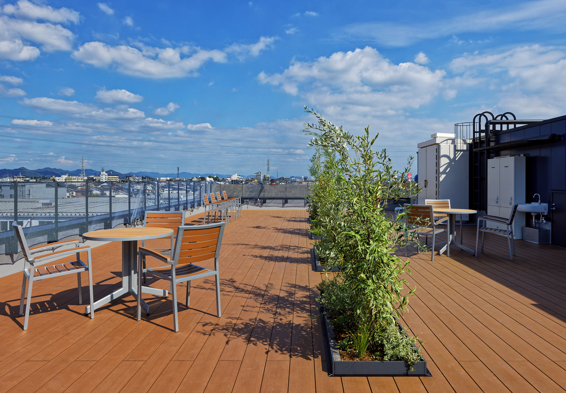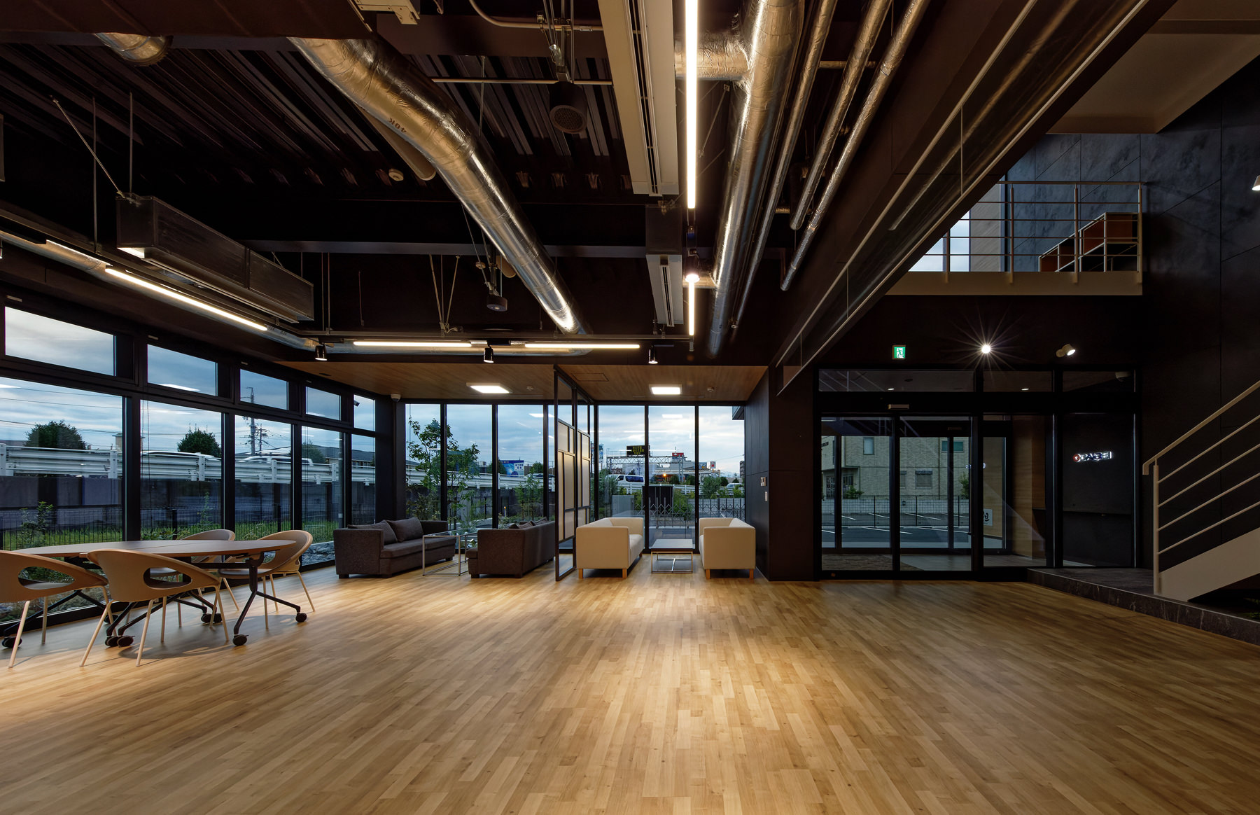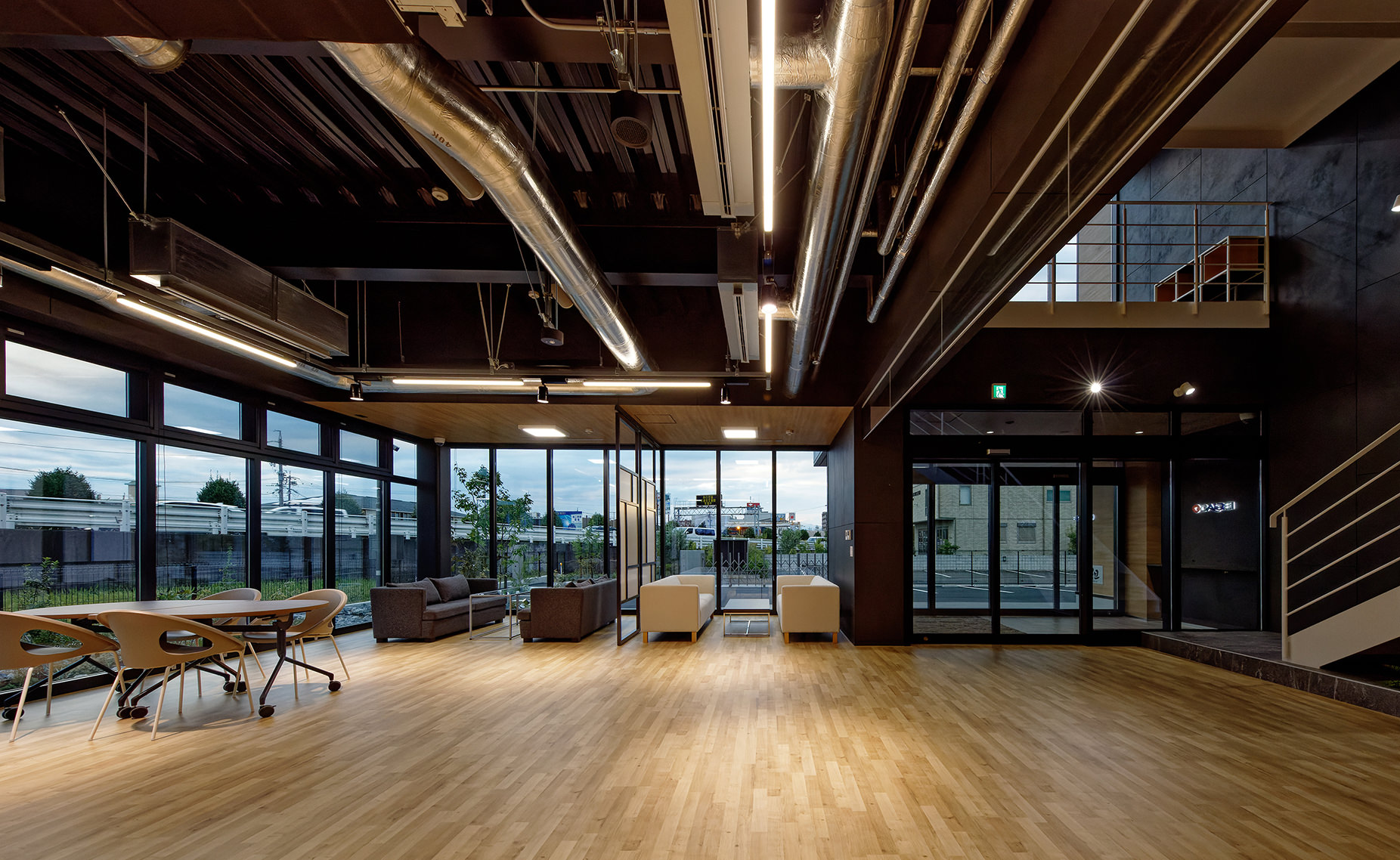 敷地は國道沿いであるため、國道側にインパクトを與えるよう、空気?熱の流れをイメージしたデザインとしました。また、來訪者への技術アピールや社員教育のため、內部空間は天井スケルトンとし、設備機器や鉄骨構造を魅せるデザインとしています。