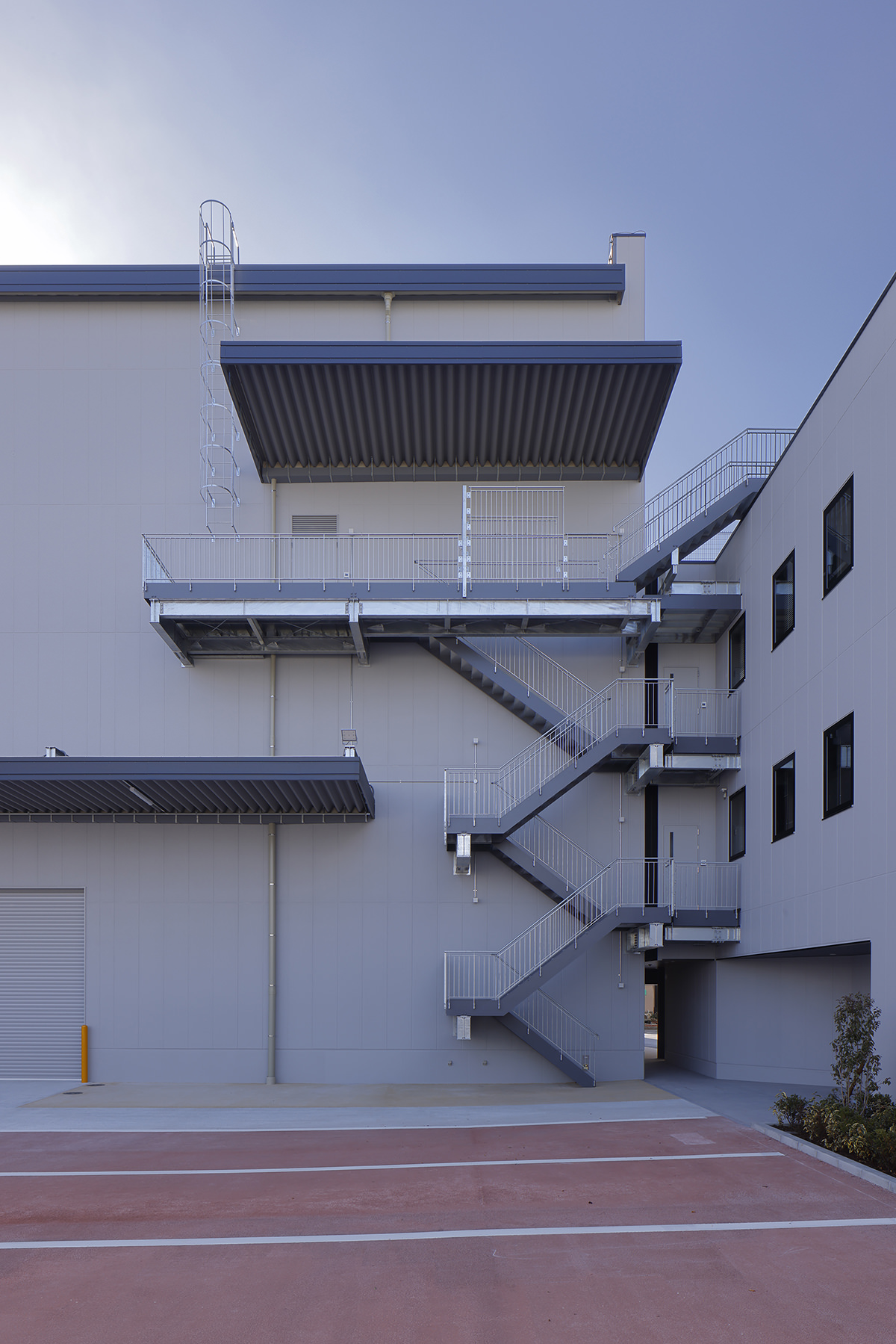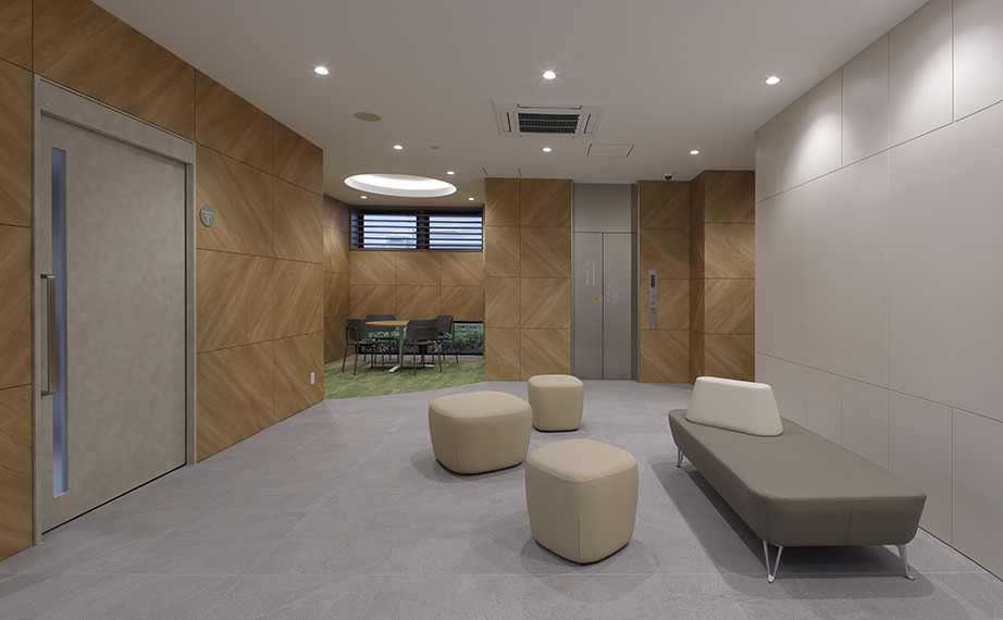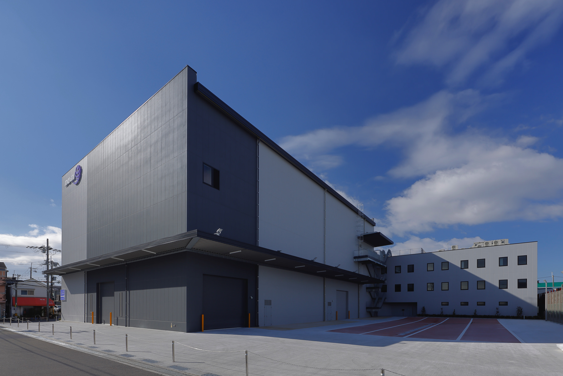 株式會(huì)社マルニコーポレーション様の主な業(yè)務(wù)は、お客様の重量物や精密機(jī)械など特殊機(jī)械を核に、保管?取付までを行います。このメカニカルなイメージから、本社事務(wù)所のメイン外壁部分にはロの字形狀の金屬アルミパネルを取り入れ、南面の日射遮蔽機(jī)能、近隣からの視線カット機(jī)能を持たせながら、本社事務(wù)所として建物ファサードにインパクトを持たせました。ロの字の內(nèi)側(cè)にはマルニコーポレーション様のコーポレートカラーを取り入れ、さりげないアクセントを取り入れました。また、計(jì)畫建物と周辺敷地を関係づけることで、地域との関わりを持たせたいと考えました。そこで、緑化計(jì)畫では、敷地南東の小さな公園から事務(wù)所入口までを緑でつなげるかのように壁面緑化を図り、南側(cè)道路での建物の圧迫感を軽減させることを狙いました。