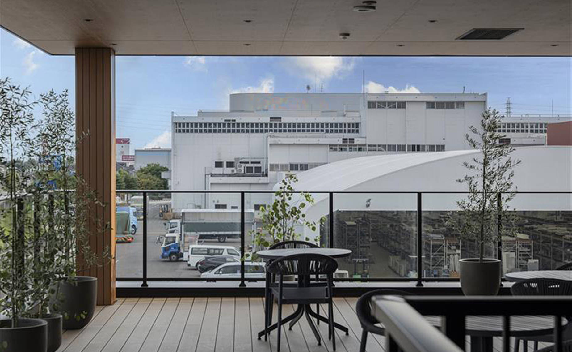 本プロジェクトは、工作機械メーカー本社工場のロッカー施設整備計畫です。毎日500名近くの従業員が利用するこの施設は、著替えるだけではなく『コミュニケーションが生まれる場』をつくる事をコンセプトにテラスを計畫しました。このテラスは、各階に設けられそれぞれの階で目的を分けています。1階はバスの待合所として扱われ、3階では研修前後のリフレッシュスペースとしても機能しています。工場敷地內の北東角に計畫した厚生棟は、隣接する工場棟とファサードデザインの差別化を図り、テラスでの賑わいと共に今後工場が変わっていく事を周辺へ発信しています。