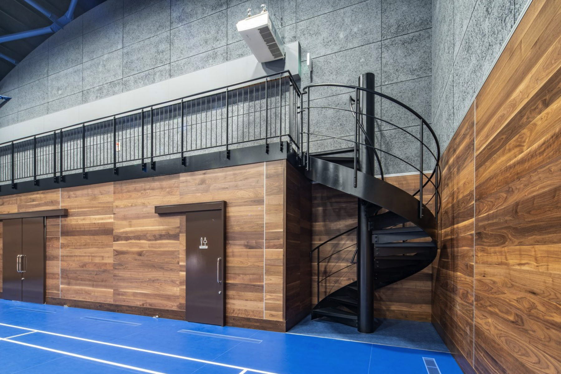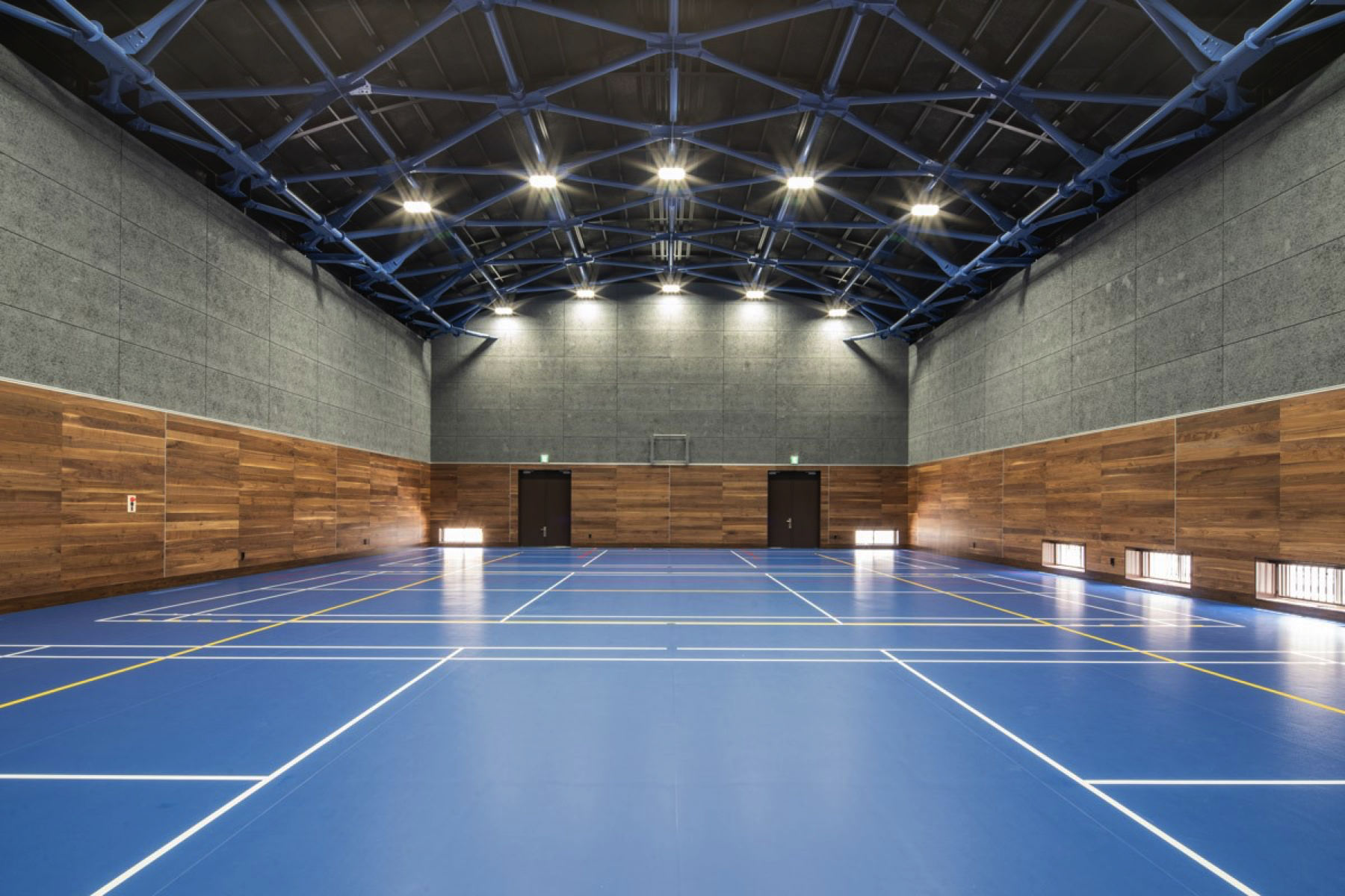 內裝について木材を取り入れ、油山の自然を感じるデザインとしただけでなく、色はバドミントンシャトルが周囲と同化しない色にすると同時に、體育館內が暗い印象とならない様に、選手と確認をしながら色の調整をしました。