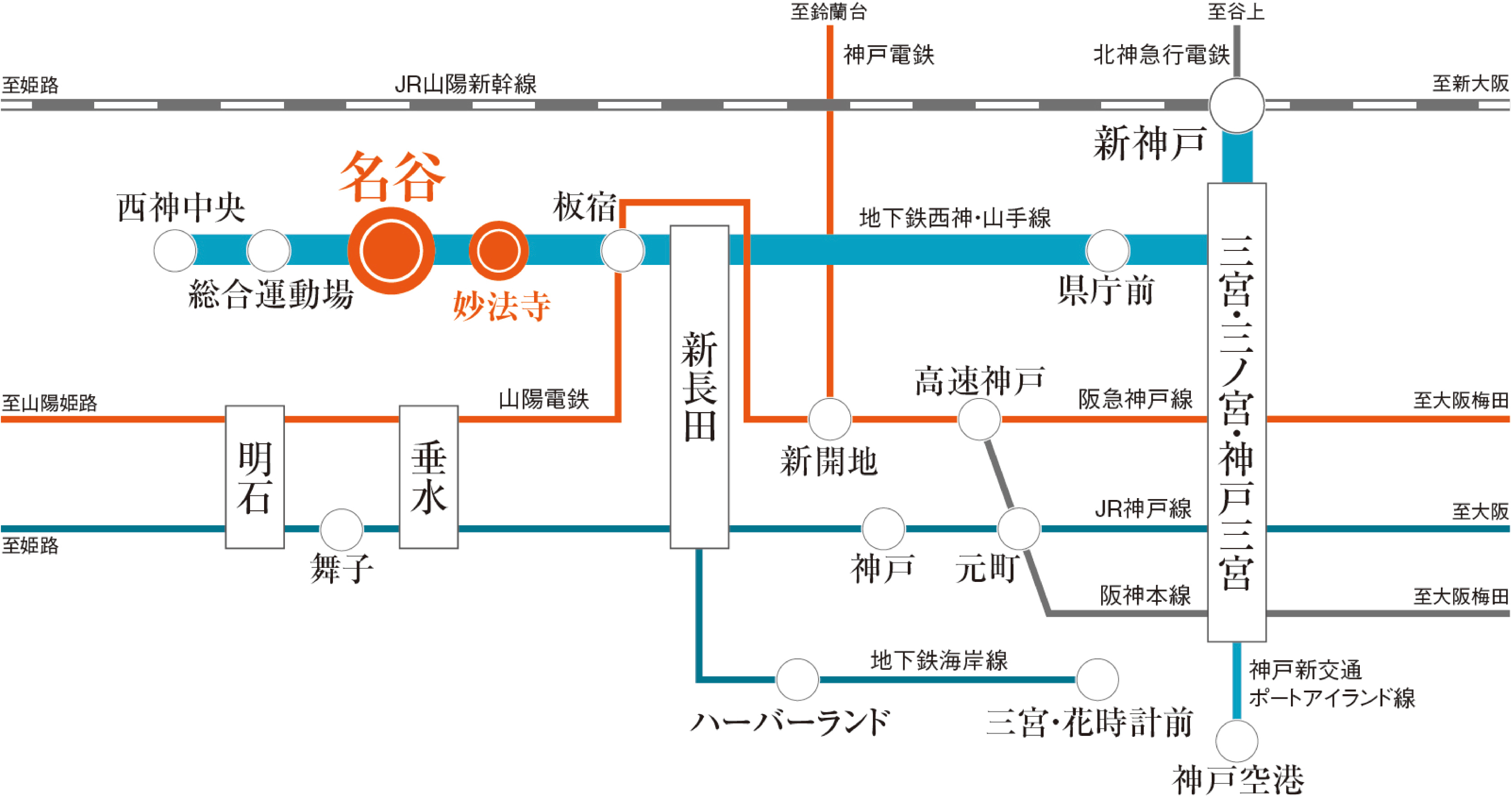 「名谷」駅からはJR山陽新幹線停車駅の「新神戸」駅へダイレクトにアクセス。「神戸空港」駅へも「三宮」駅から神戸新交通ポートアイランド線が利用できるので、遠方に出かける出張やレジャーに便利です。
