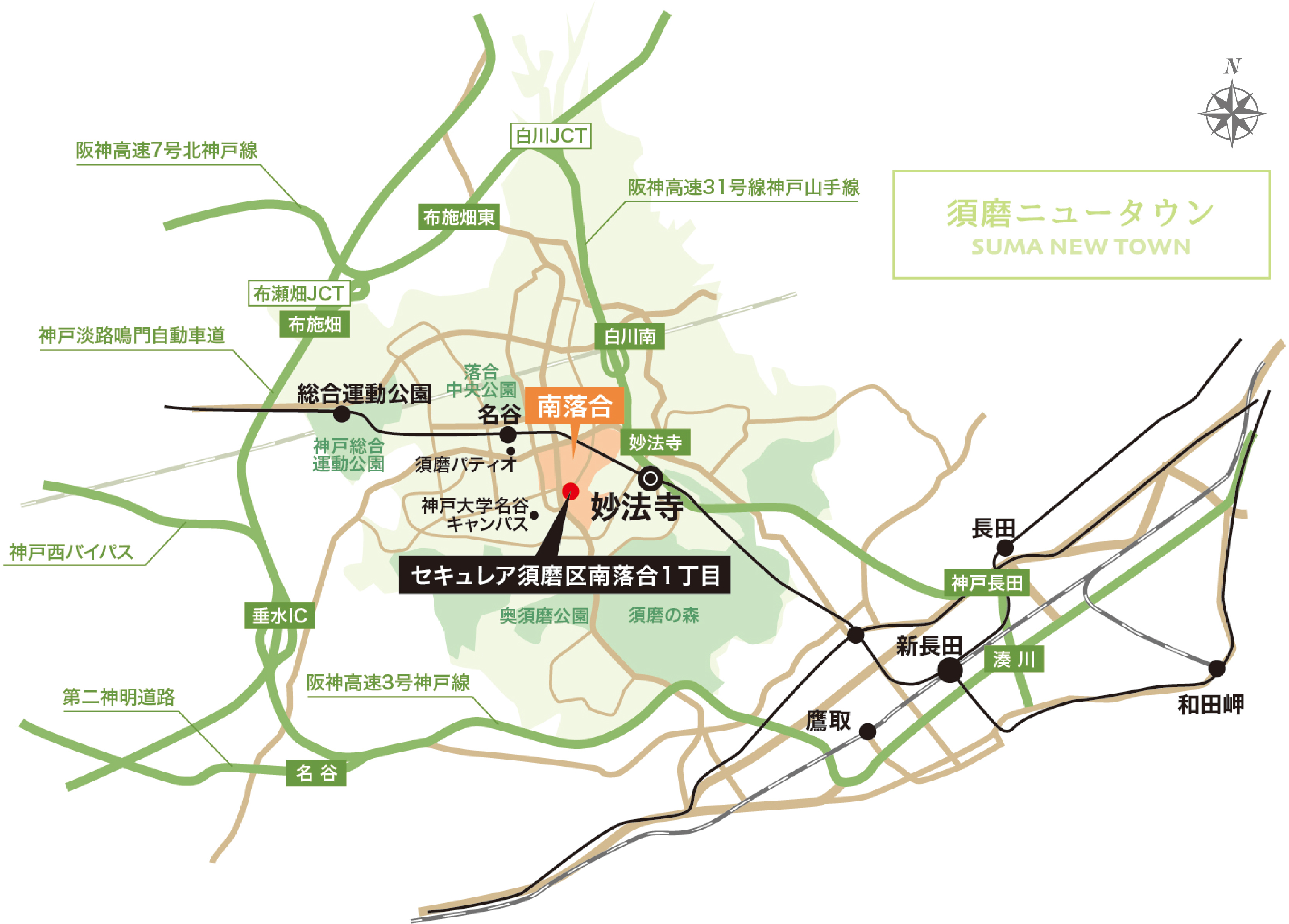 須磨區周辺は複數の高速道路があり、カーアクセスが便利なエリア。淡路島方面は「垂水I.C」、三宮?神戸方面へは「妙法寺IC」、山陽方面へは「布瀬畑東I.C」など、目的地に合わせていくつかのインターチェンジをご利用いただけます。