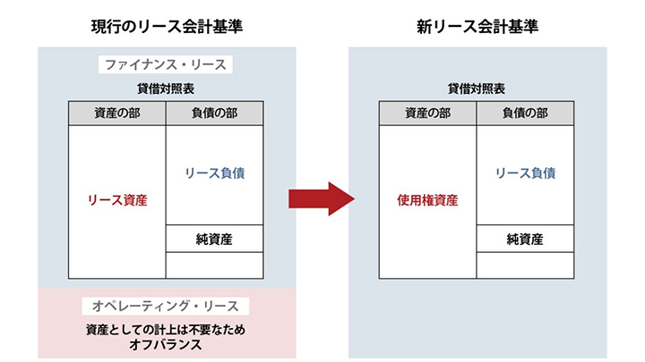 最も大きな変更點は、これまでのファイナンスリース取引とオペレーティングリース取引の區分が廃止されたことです。これにより、原則としてすべてのリース取引を貸借対照表(B/S)の資産と負債に計上することになり、すべてオンバランス処理となります。*12ヵ月以內の短期リースや少額資産のリースなど一部の例外を除きます。