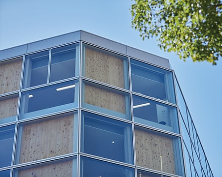 外周部のCLTパネルがガラスで覆われた外観。