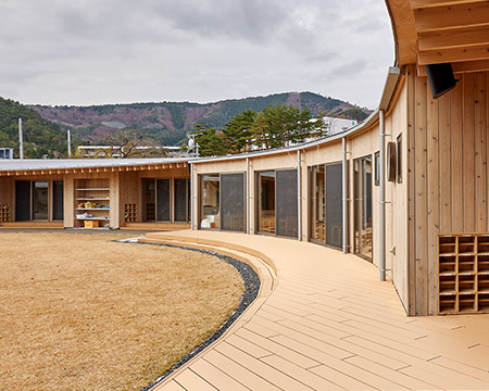 各保育室からひとつながりで外遊びがしやすく、子どもたちを見(jiàn)守りやすい設(shè)計(jì)に。中間領(lǐng)域となるデッキは心地よい居場(chǎng)所になります。