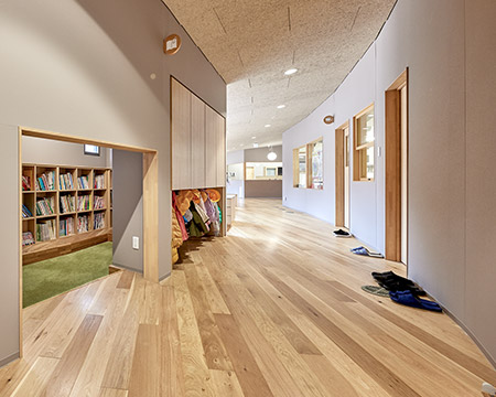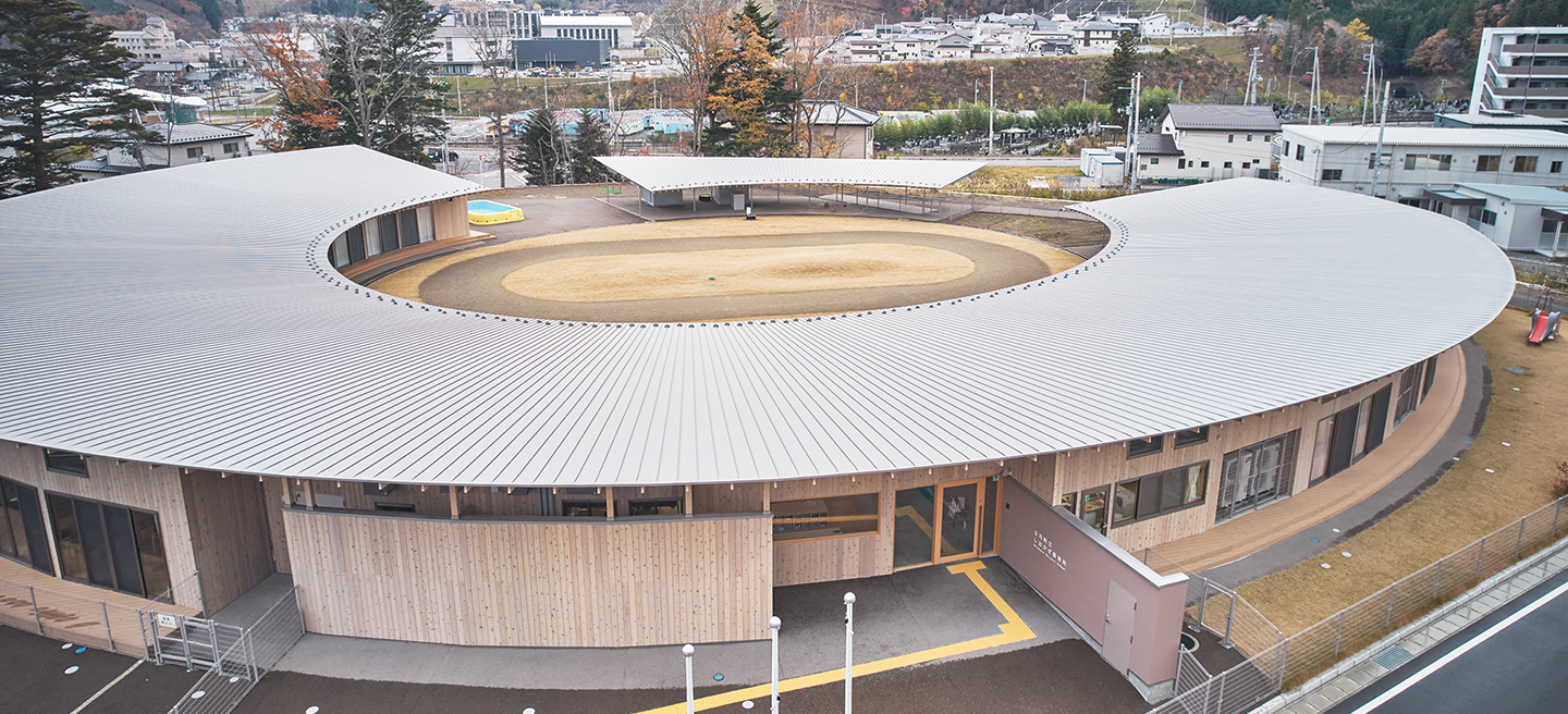 住宅地(災(zāi)害公営住宅)と町の中心をつなぎ、女川灣を望む都市景観軸にかかるように建つ園舎。園庭を囲む設(shè)計(jì)が保育室やランチルームに豊かさをもたらします。