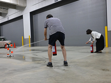 訓練用の水消火器を使って、実際に消化活動を體験する放水訓練