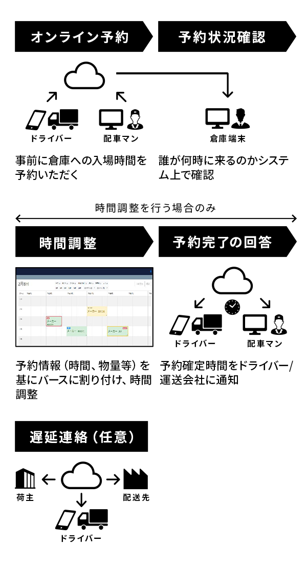 [オンライン予約]事前に倉庫への入場時間を予約いただく →[予約狀況確認(rèn)]誰が何時に來るのかシステム上で確認(rèn) →[時間調(diào)整(時間調(diào)整を行う場合のみ)]予約情報(時間、物量等)を基にバースに割り付け、時間調(diào)整 →[予約完了の回答(時間調(diào)整を行う場合のみ)]予約確定時間をドライバー/運送會社に通知 →[遅延連絡(luò)(任意)]ドライバーがシステム経由で遅延連絡(luò)