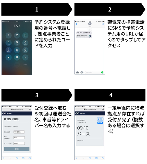 [1]予約システム登録用の番號へ電話し、拠點事業(yè)者ごとに定められたコードを入力 →[2]架電元の攜帯電話にSMSで予約システム用のURLが屆くのでタップしてアクセス →[3]受付登録へ進む※初回は運送會社名、車番等ドライバー名も入力する →[4]一定半徑內(nèi)に物流拠點が存在すれば受付が完了(複數(shù)ある場合は選択する)