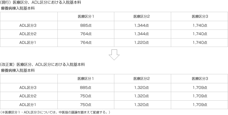 醫療経済実態調査結果等を踏まえて、療養病棟入院基本料の評価を引き下げる。なお、醫療區分1?ADL區分3については、中醫協の議論を踏まえて配慮する。