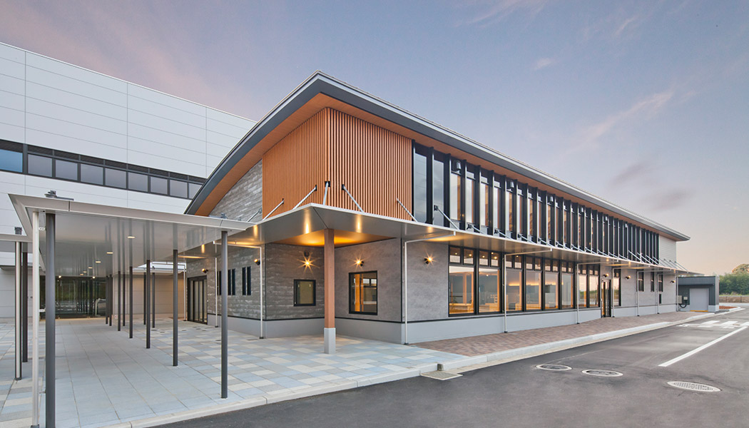 創業から共に歩んできた北九州で「今後も地域と共に発展したい」という想いを込め、構想から30年を経て完成。工場棟のZEB実現に加え、従業員のための食堂や保育園には木質材を多用し、心地よい空間を実現できました。