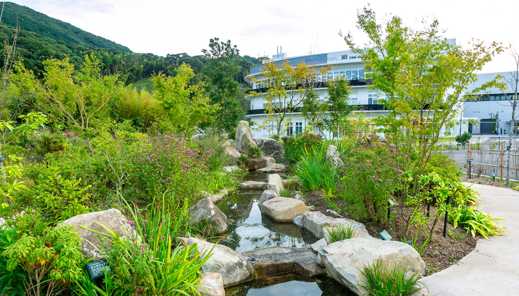 広大な敷地內に、従業員の働きやすさと自然環境に配慮して建設された本社工場を新設したプロジェクトです。「本社屋」と、ものづくりを行う「工場棟」「金型棟」、研究開発を行う「R&D CENTER」、従業員のための「Café&Marché(従業員食堂)」や「タカギキッズ保育園」、ホタルを成育する「ホタルの小川」を併設しています。