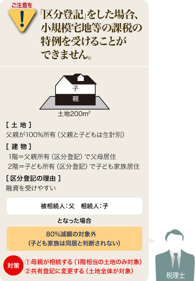 ![ご注意を[?區(qū)分登記?をした場合、小規(guī)模宅地等の課稅の特例を受けることができません。][土地]父親が100%所有(父親と子どもは生計別)[建物]1階=父親所有(區(qū)分登記)で父母居住/2階=子ども所有(區(qū)分登記)で子ども家族居住[區(qū)分登記の理由]融資を受けやすい。被相続人:父 相続人:子 となった場合 80%減額の対象外(子ども家族は同居と判斷されない)[対策](1)母親が相続する(1階相當(dāng)の土地のみ対象)(2)共有登記に変更する(土地全體が対象)](images/tax03_img08.gif)