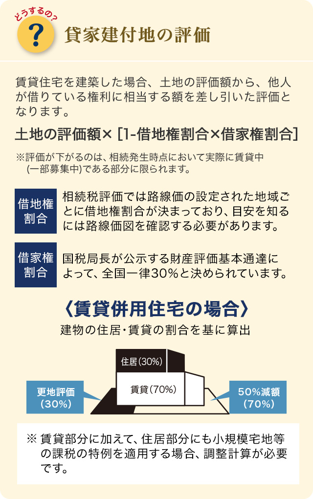 ![どうするの?[貸家建付地の評価]賃貸住宅を建築した場合、土地の評価額から、他人が借りている権利に相當(dāng)する額を差し引いた評価となります。土地の評価額×[1-借地権割合×借家権割合]※評価が下がるのは、相続発生時點において実際に賃貸中(一部募集中)である部分に限られます。[借地権割合]相続稅評価では路線価の設(shè)定された地域ごとに借地権割合が決まっており、目安を知るには路線価図を確認(rèn)する必要があります。[借家権割合]國稅局長が公示する財産評価基本通達によって、全國一律30%と決められています。<賃貸併用住宅の場合>建物の住居?賃貸の割合を基に算出 ※賃貸部分に加えて、住居部分にも小規(guī)模宅地等の課稅の特例を適用する場合、調(diào)整計算が必要です。](images/tax03_img10.gif)