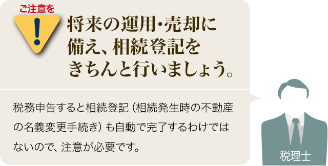 ![ご注意を[將來の運用?売卻に備え、相続登記をきちんと行いましょう。]稅務(wù)申告すると相続登記(相続発生時の不動産の名義変更手続き)も自動で完了するわけではないので、注意が必要です。](images/tax03_img11.gif)