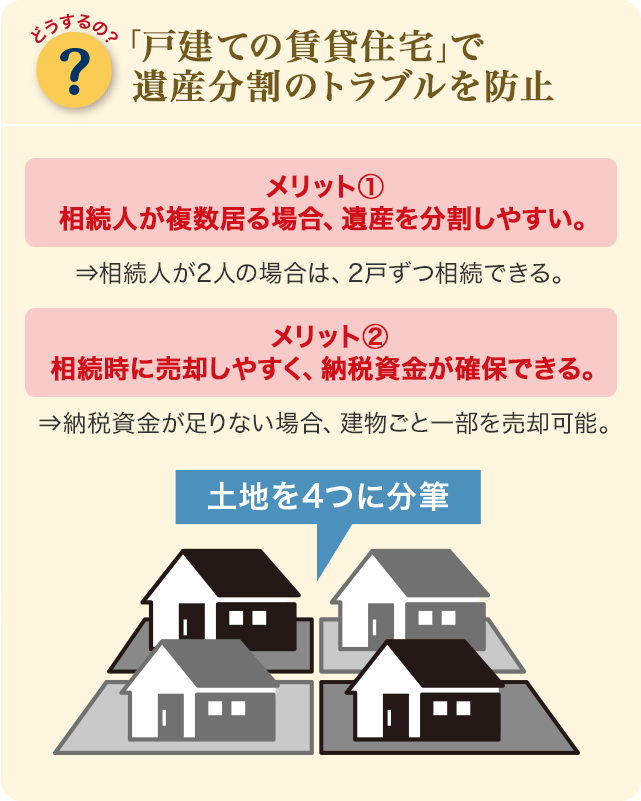 ![これでOK[?戸建ての賃貸住宅?で遺産分割のトラブルを防止] メリット(1) 相続人が複數(shù)居る場合、遺産を分割しやすい。?相続人が2人の場合は、2戸ずつ相続できる。 メリット(2) 相続時に売卻しやすく、納稅資金が確保できる。?納稅資金が足りない場合、建物ごと一部を売卻可能。](images/tax03_img13.gif)