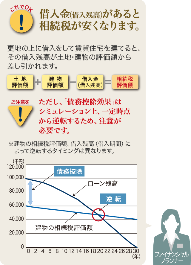 ![これでOK[借入金(借入殘高)があると相続稅が安くなります。]更地の上に借入をして賃貸住宅を建てると、その借入殘高が土地?建物の評価額から差し引かれます。[土地評価額]+[建物評価額]-[借入金(借入殘高)]=[相続稅評価額] ご注意を ただし、?債務(wù)控除効果?はシミュレーション上、一定時點から逆転するため、注意が必要です。※建物の相続稅評価額、借入殘高(借入期間)によって逆転するタイミングは異なります。](images/tax03_img14.gif)