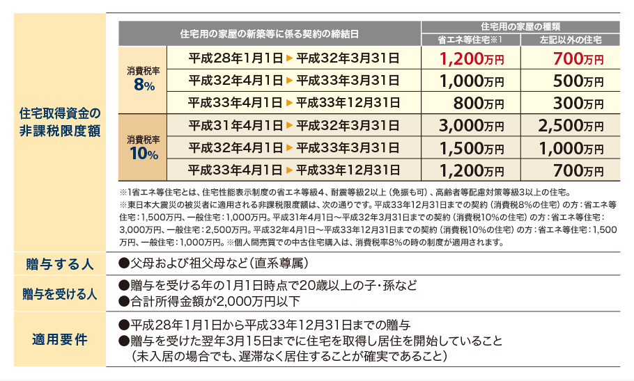 - ※2 省エネ等住宅で平成32年3月31日までの契約(消費稅8%の住宅)、東日本大震災被災者は平成33年12月31日の契約まで非課稅限度額1,500萬円(消費稅8%の住宅)