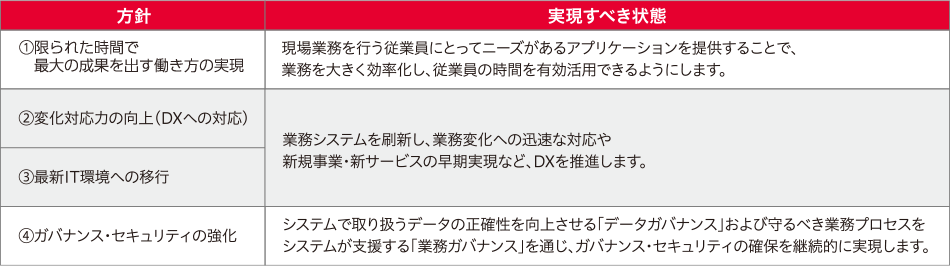 そこで、レガシーシステムのモダナイゼーション(*3)に取り組み、これからの當社グループにおける「事業の多角化?ビジネス成長」、「営業スタイルの変革」、「働き方改革への対応」など社內外の環境変化に迅速に対応できるDXを支える基盤へと刷新します。(表1)