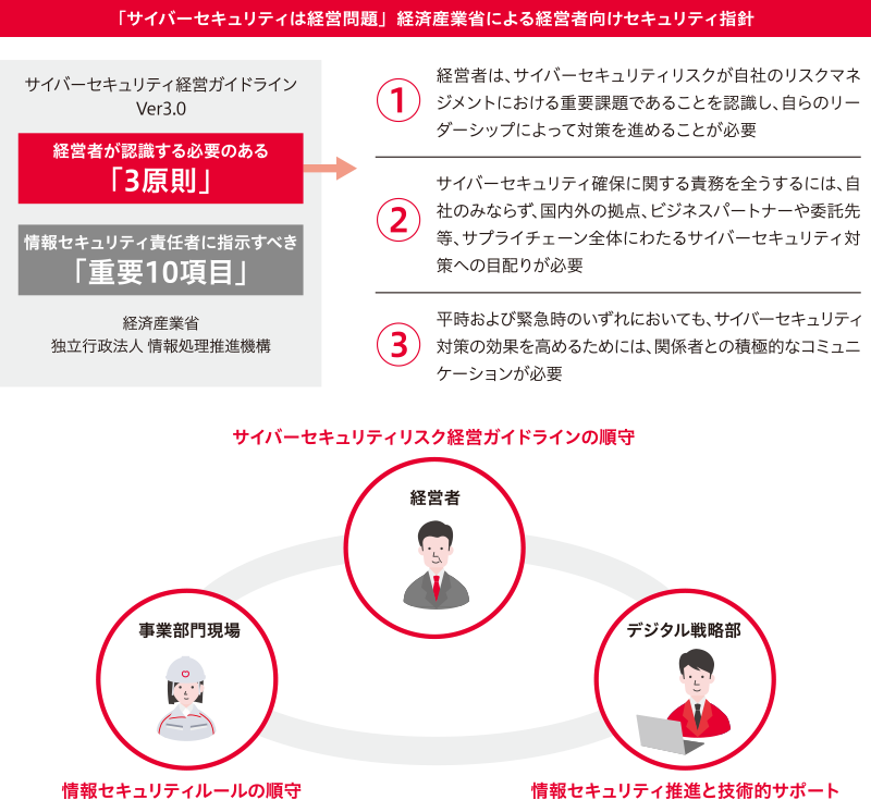 當社グループは「情報セキュリティリスク」が引き起こす被害の深刻性を認識するとともに、最優先に防止すべきリスクと捉え、「サイバーセキュリティ経営ガイドライン(経済産業省)」に基づき、経営層?現場?デジタル戦略部が三位一體となって情報セキュリティ対策に取り組んでいます。(図1)