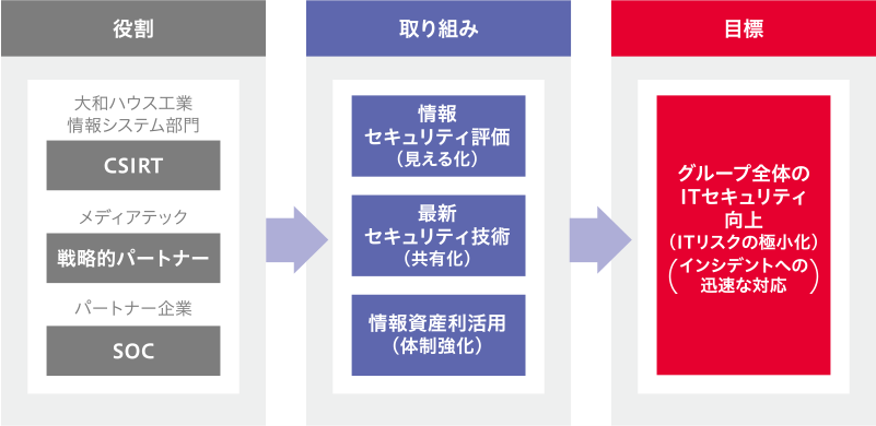 情報システム部門を中心にCSIRT(*3)/SOC(*4)を稼働しています。2022年度に國內グループ會社を対象に構築した24時間365日のセキュリティ監視體制は、現在対象範囲を海外グループ會社まで拡げております。また、グループ會社のメディアテックおよびパートナー企業と共に情報セキュリティ支援體制を整え、各グループ會社のIT擔當者とのコミュニケーションを通じてセキュリティトピックの提供やセキュリティレベルの実態把握、問題解決の指導なども行っています。