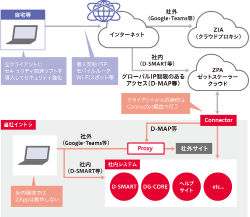 従來のモバイルアクセス環境は閉域LTEを使用した方式でしたが、「Zscaler」を導入し、自宅のインターネットや安全なWi-Fi環境から安心して社內インフラを利用できる環境を構築しました。(図3)(図4)
