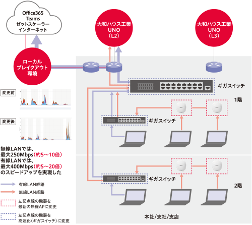 また、インターネット上に存在するSaaSシステムの利用増加にともなう社內ネットワークの通信量増加に耐えられるように、事業所のネットワークインフラ(ローカルブレイクアウト)の構築を行いました。(図5)(図6)