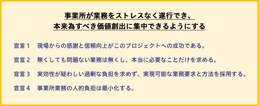 事業現場へ提供する価値を本気で創出するため、プロジェクト基本原則として以下の“プロジェクト宣言”を定め、これらの方針のもとに推進しています。