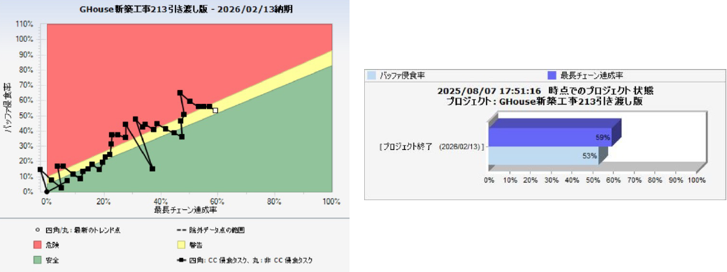 2024年度に完了したプロジェクトは525件でした。各プロジェクトでは、進行中に確保されたCCPMバッファ(余裕期間)の消費狀況を色分け(緑=安全、黃=警告、赤=危険)によって早期解決につなげています。