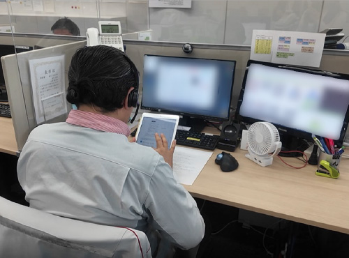 物流倉庫においてタブレット端末で現地スタッフとの通話から館內資料閲覧、入退館管理などをペーパーレスでスマートに行うことができる受付アプリを內製開発しました。