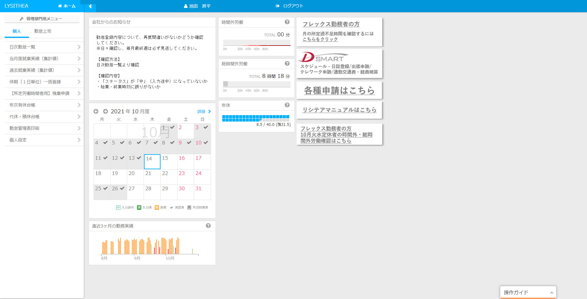 従業員の働き方改革の一環として、2021年度に「フレックスタイム制」を導入しました。この制度を運用するため、社用パソコンへのログインからログオフまでの時間を自動的に勤務時間として記録できるようにしました。出社?退社の申請が必要なく、社用パソコンのデータをそのまま活用することで漏れなく勤務実態を把握でき、勤怠をチェックする事務作業も大幅に削減しました。