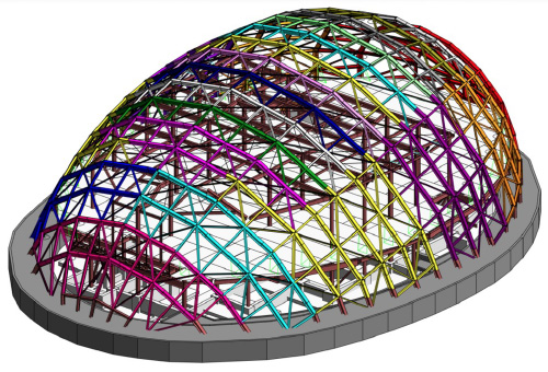 本建物はタマゴ狀の形態からうまれる曲面狀の構造物を地中に埋め込んだ形狀となっています。外殻主架構が全て15度傾いている點が特徴的であり、多角形に直線部材を配置した美しく、難解なアーチ狀の軀體構築に取り組みました。