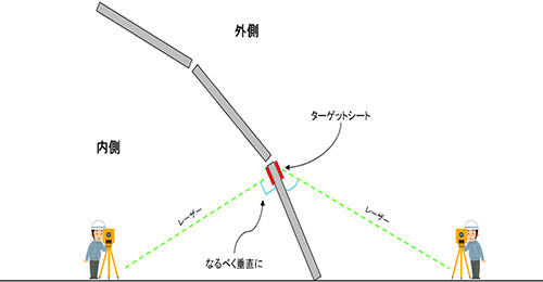 BIMモデルより約820か所の座標を計算、現場にてモデル位置にターゲットを配置トータルステーションにて鉄骨建て方、建て入れ計測を行いました。