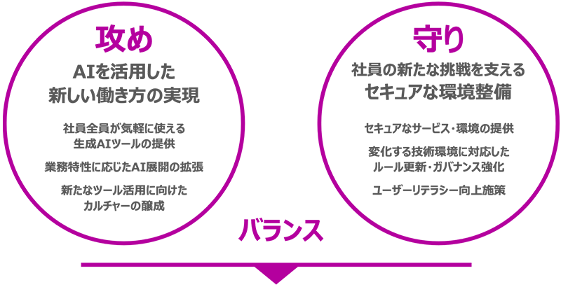 「攻め」のIT施策の一環として、當社では「AIを活用した新しい働き方の実現」に取り組んでいます。當社では2023年より生成AIの業務活用を本格的に開始しましたが、昨今の著しい技術革新により活用できる範囲が拡大しつつあります。一方でAI活用を進める中でのリスクも顕在化しており、ガバナンス強化にも取り組むことが求められています。「攻め」と「守り」のバランスを取りつつ有効活用に向けた検討を進めています。