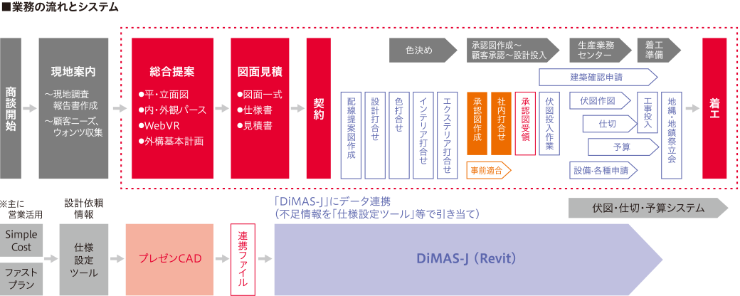 BIMによる事業DXの実現に向けて住宅系事業では、BIMデータを顧客情報およびものづくり情報と一元化することで、BIMデータの高度活用と競爭優位性の確立を目指しています。BIM導入前は、仕様データとCADデータとの整合性をとるために「同期処理」が必要でしたが、現在はBIM対応の3次元CAD(Revit)をベースに3Dモデルと仕様データを統合したBIMデータとして運用活用しています。