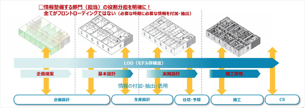 賃貸住宅では、BIMデータを作成するためのCAD関連ツール展開を終え、BIMデータを活用することによる業務の効率化や新たな付加価値の創造に取り組んでいます。モノづくりの工程に応じてBIMモデルの粒度を粗→密に上げていくことで、効率的に精度の高いBIMデータを作成し、設計工程だけではなく施工やCSなどの業務においてもBIMデータを活用することを目指しています。