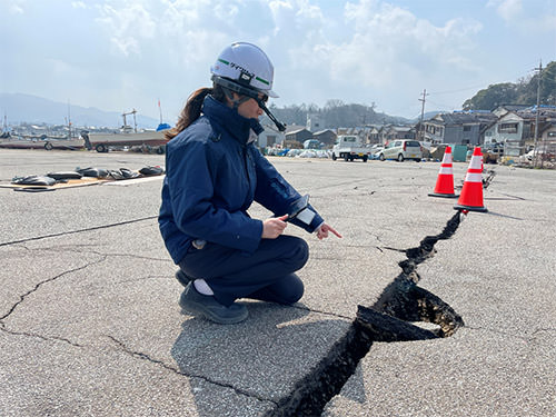 令和6年能登半島地震においては、自動配置プログラム、人工衛星を利用したGNSS測量、スマートグラスによる遠隔現地調査を取り入れ、現地調査から配置図作成までの業務において、従來の業務時間に比べて10時間以上図面を早く作成することができました。