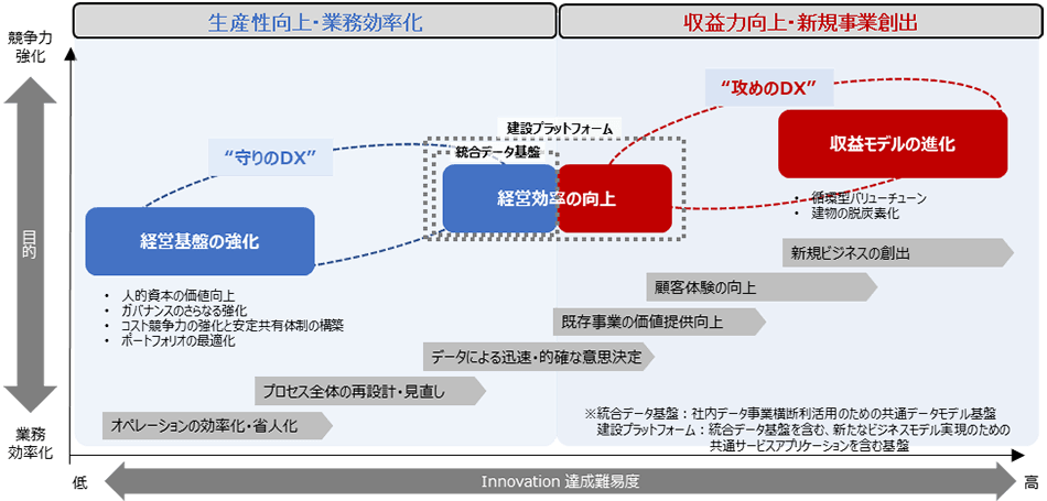 當社では、持続的に成長可能な企業を目指したビジネスモデル変革に向けて、収益力向上や新規事業創出につながる取り組み(「攻めのDX」)と2024年建設業の殘業規制の対応や各事業領域の成長課題から生産性向上や業務効率化といった経営基盤の強化(「守りのDX」)との両立を目指しています。